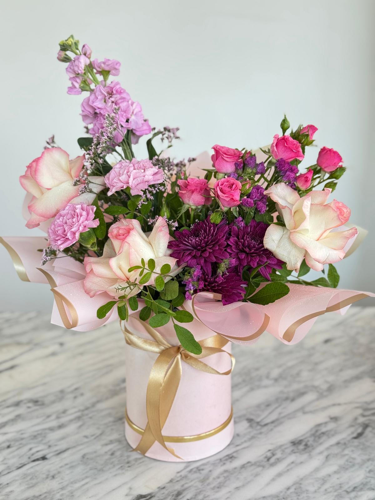 Mixed of pink and purple flowers elegantly arranged on a box.