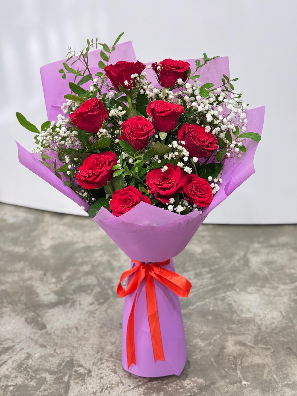 10 pcs ecuadorian red roses nicely done in purple wrapping.